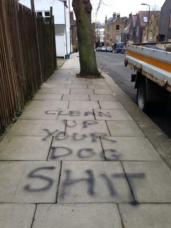 It’s obviously all got too much for the residents of Gondar Gardens. This bit of random graffiti appeared on the pavement a few days ago. I rather like the “let’s break the law to fix someone breaking the law” strategy.